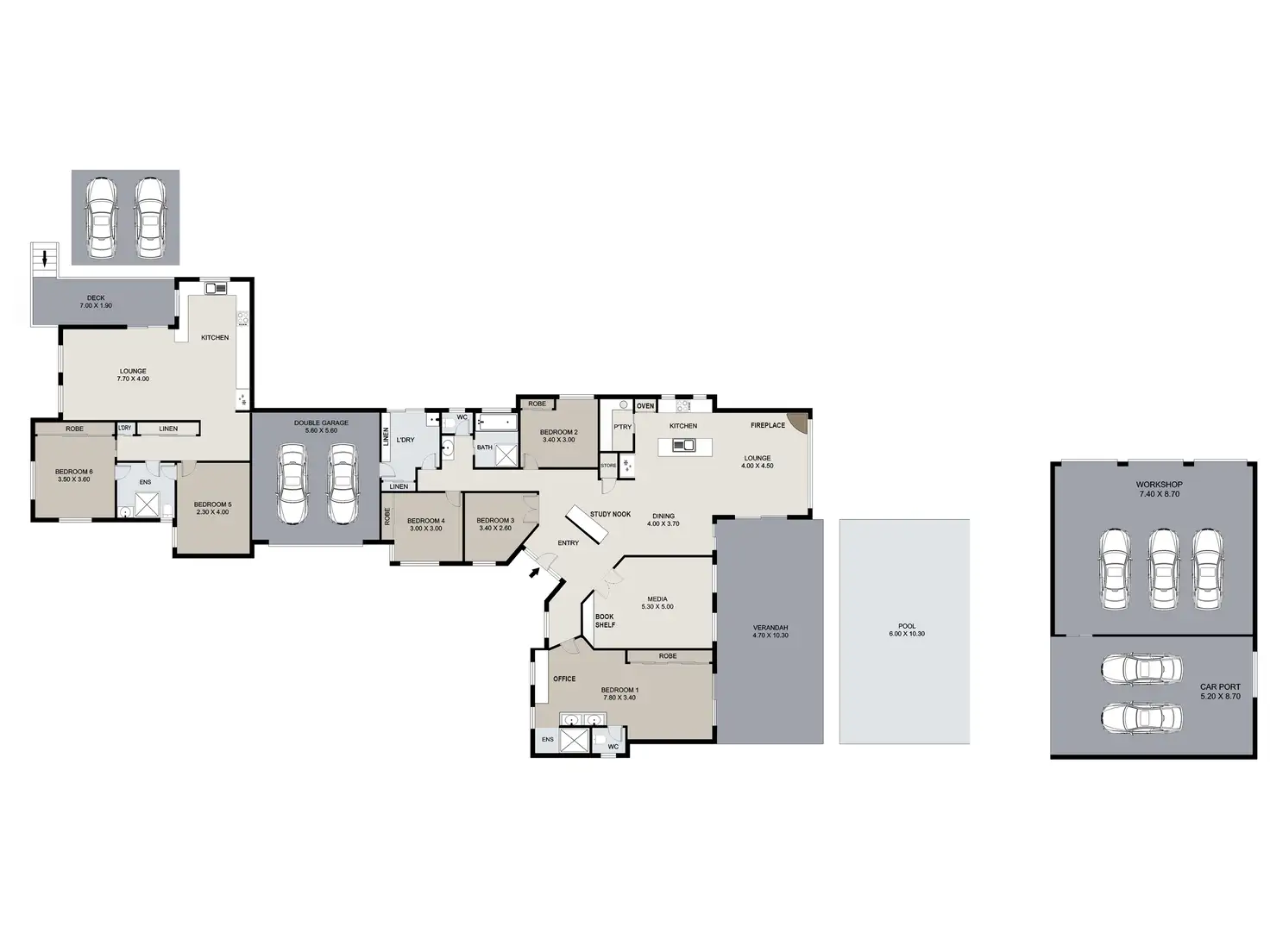 • Large 3 bay shed with power, water and adjoining space for an additional 4 cars