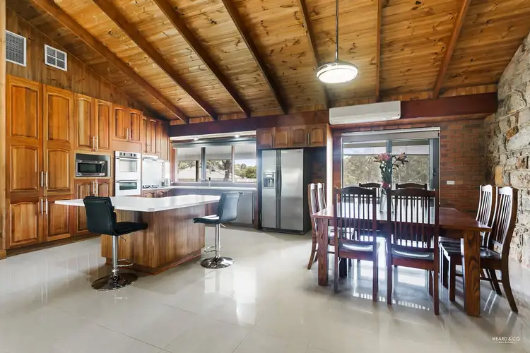 The formal lounge room is of grand proportions with a stone feature wall. Built with stone sourced locally from Central Victoria this room is made complete with its rustic fireplace and built in bar