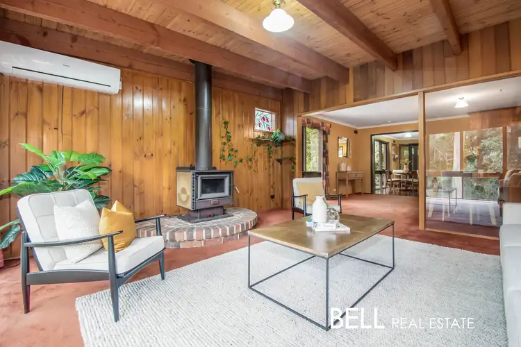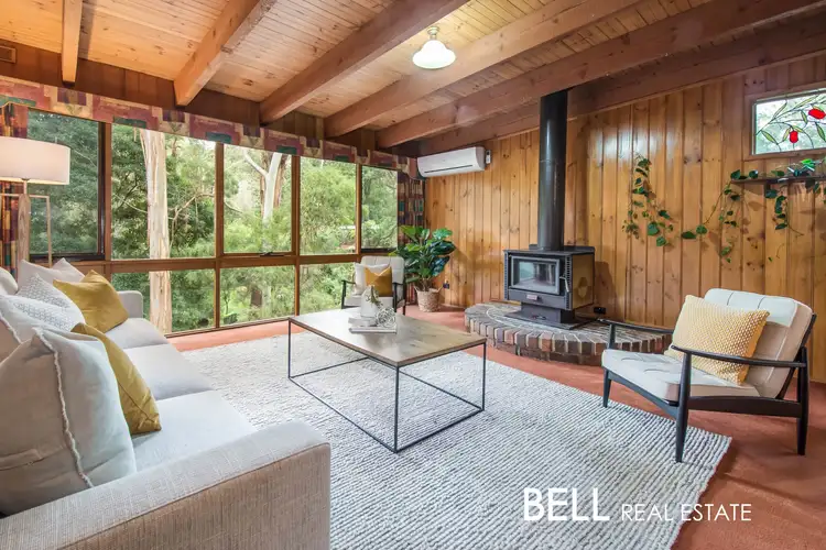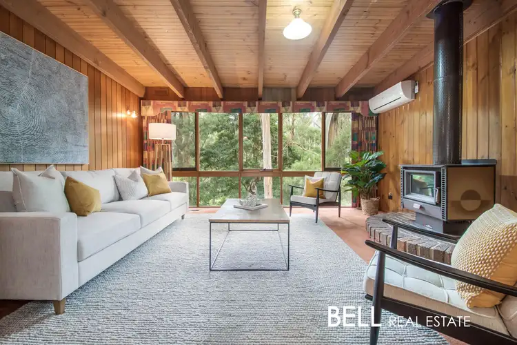 On the upper level, a grand open plan living zone accentuated by rustic timber lined ceilings and exposed beams is the heart of the home. Positioned down one end is a lounge with floor to ceiling windows framing leafy views and a wood fire to keep things toasty in the colder months. An adjacent dining/living zone connects with an eat-in timber kitchen well equipped with all the essentials and encompasses a fabulous layout if you choose to update or redesign.