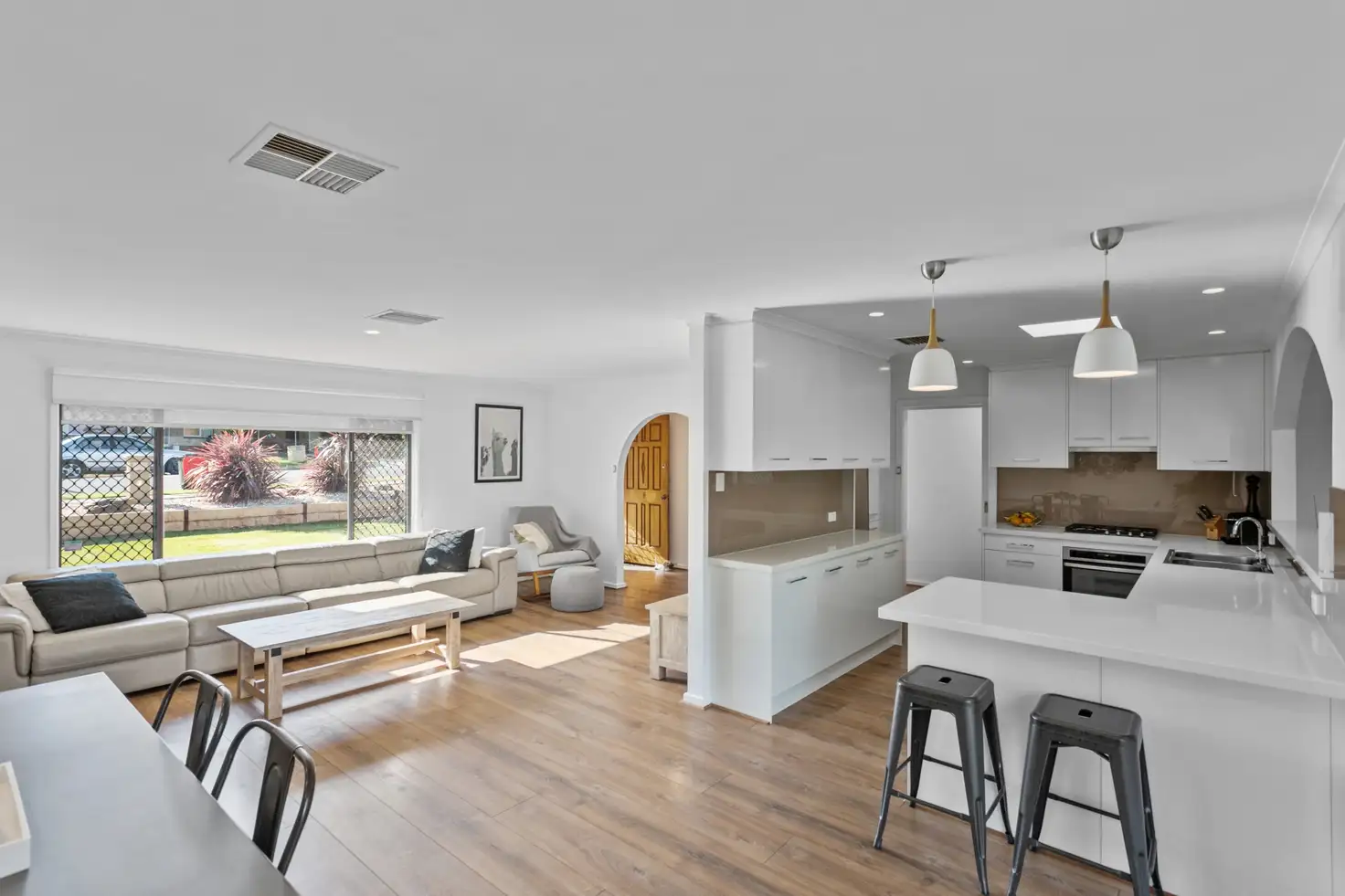 The front of the property offers a tidy, low maintenance front yard along with a double carport and single, drive through garage. Inside, you're presented with the master bedroom, at the front of the home, made complete with a four bay, mirrored, built in robe and modern, renovated ensuite bathroom. To the right of the entrance is the open plan living, dining and kitchen area - the hub and heart of this wonderful home. New flooring, lights, blinds and neutrally painted throughout, you'll love how this home feels and presents.