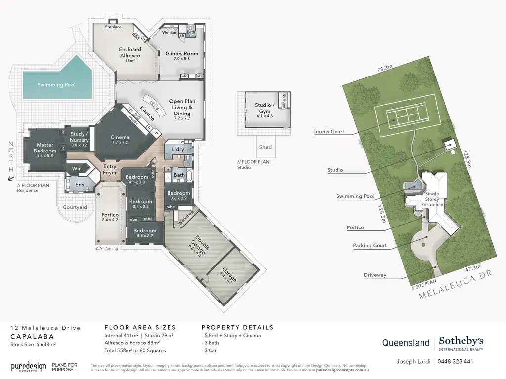 - Large pool, championship-size floodlit tennis court, separate gym/guest house