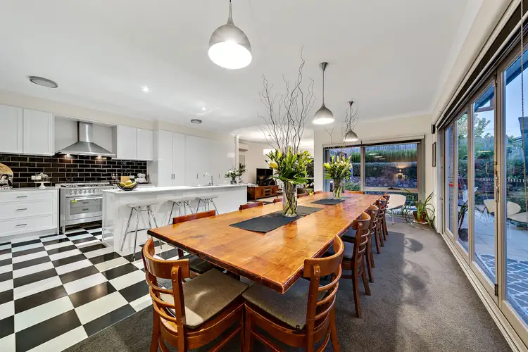 Living up to its place as the heart of the home, the kitchen is light and spacious with black and white tiling, subway tile splash back, sleek white cabinetry, ample storage, long island bench with breakfast bar and double sink, granite bench tops, and stainless steel appliances.
