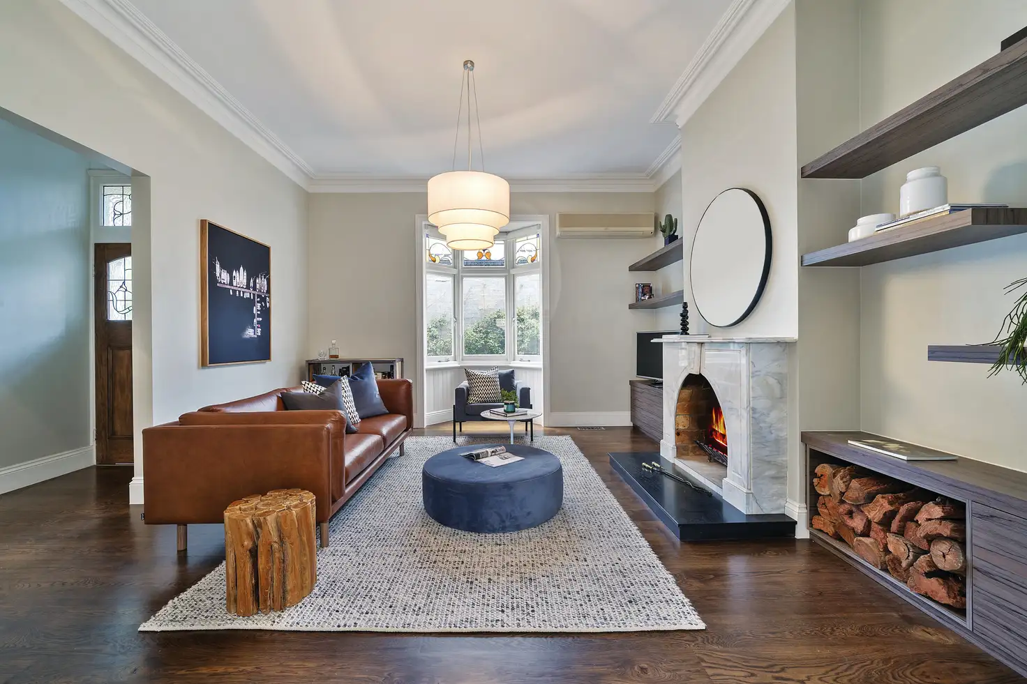 * Spacious lounge room with marble-finished open fireplace, integrated cabinetry and bay window