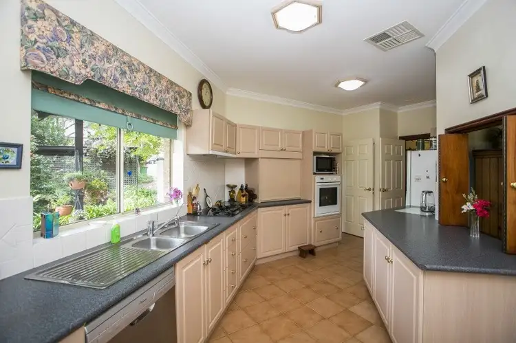 This beautiful three bedroom home is well maintained, with two large bathrooms, substantial kitchen with pantry and dining area, living room with formal dining area, inviting entry area with stained glass features, laundry room with direct outdoor access, ducted evaporative air conditioning, gas heating, and up to date electrics and plumbing. The spacious master bedroom has spectacular views, built in wardrobes, and en-suite bathroom with dual sinks, plenty of room for two. The circular driveway connects with a large garage that extends from the front of the home to the verandah in the back of the home, ideal for a workshop or hobby room; ample off road parking for a caravan or boat, in addition to the covered carport for two more vehicles. All of this is located behind a privacy wall in the front of the property that is draped in flowering plants. The garden has the best of both worlds a fragrant rose garden in the front of the home, a kitchen garden for herbs and veggies if you desire, and low-maintenance native garden down the gentle slope into regional parkland, all with seating areas to enjoy the vista.