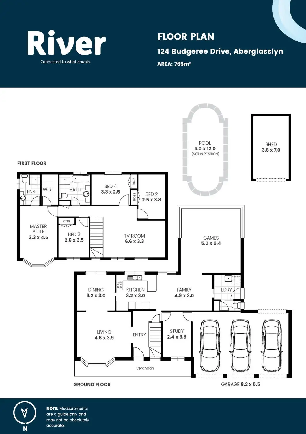 Set on a 765sqm block, the two-storey design of the house leaves plenty of room in the backyard for the large paved pool area, as well as the expanse of freshly-turfed grass and a concreted area that connects the drive-through access from the triple garage to an additional single car Colorbond shed.