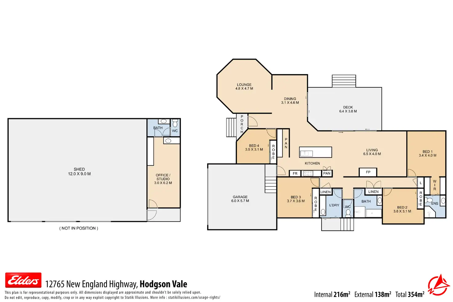• Substantial shed with a professional office. 15m x 9m shed with power, high doors (approx. 2.8m), and ample space for the avid car enthusiast or caravan owner.