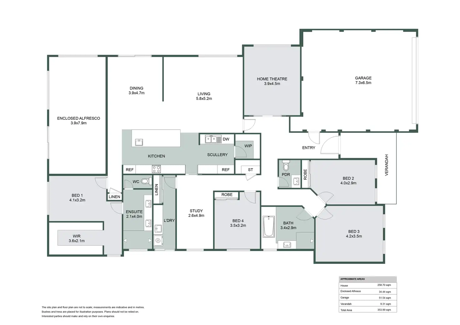 The left wing of the home accommodates the additional bedrooms and study. Bedrooms 2 and 4 include built-in robes, while bedroom 3 is the largest of the minor bedrooms. A spacious study is easily accessible through both the hallway and kitchen, making it ideal for a home office. The main bathroom is well-appointed with a shower, a large spa bath, and floor-to-ceiling tiles, while a separate powder room adds extra convenience. Zoned ducted reverse-cycle air conditioning ensures comfort throughout the entire home, adapting to suit every season.