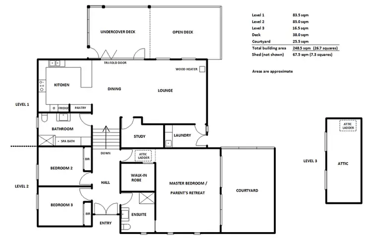 This truly is a house for all seasons, with the partially enclosed deck as a great entertaining or living space. The sunny living areas are also in prime position for the fireplace, which heats the whole home. Reverse cycle heating is also installed. The spa bath and large showers offer relaxation. An expansive master bedroom, with ensuite and walk-in robe, opens onto a private courtyard, ideal as a parents' retreat or safe place for young children to play. As well as three bedrooms and study/guest room, there is an attic room with data cabling (linked from the study throughout the house). Further work space/storage is generous in the high 3 bay shed, serviced with 40 amp power, ample lighting and 3m high roller doors for boat storage. There is drive-through access, provided by a 3m roller door on the rear wall, linking to a second driveway.
