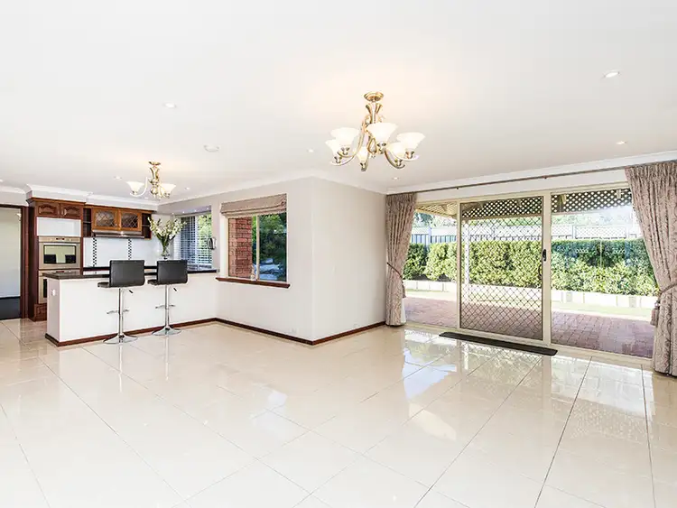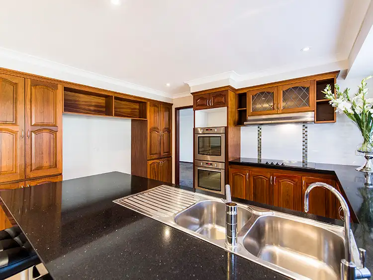 The formal lounge and dining are spacious extremely spacious with a classic wood fireplace to keep you toasty warm in winter. The dining room together with entrance hall give you access to the kitchen, meals and family room. The kitchen has a country feel with stunning Jarrah accent cupboards and trims which is a theme that carries beautifully through the entire home. Black granite bench tops and breakfast bar add a modern feel to the kitchen, which also features and induction stove top, double wall ovens, dishwasher and built in room for a fridge freezer pair. This open plan area can also be closed off for added privacy when required.