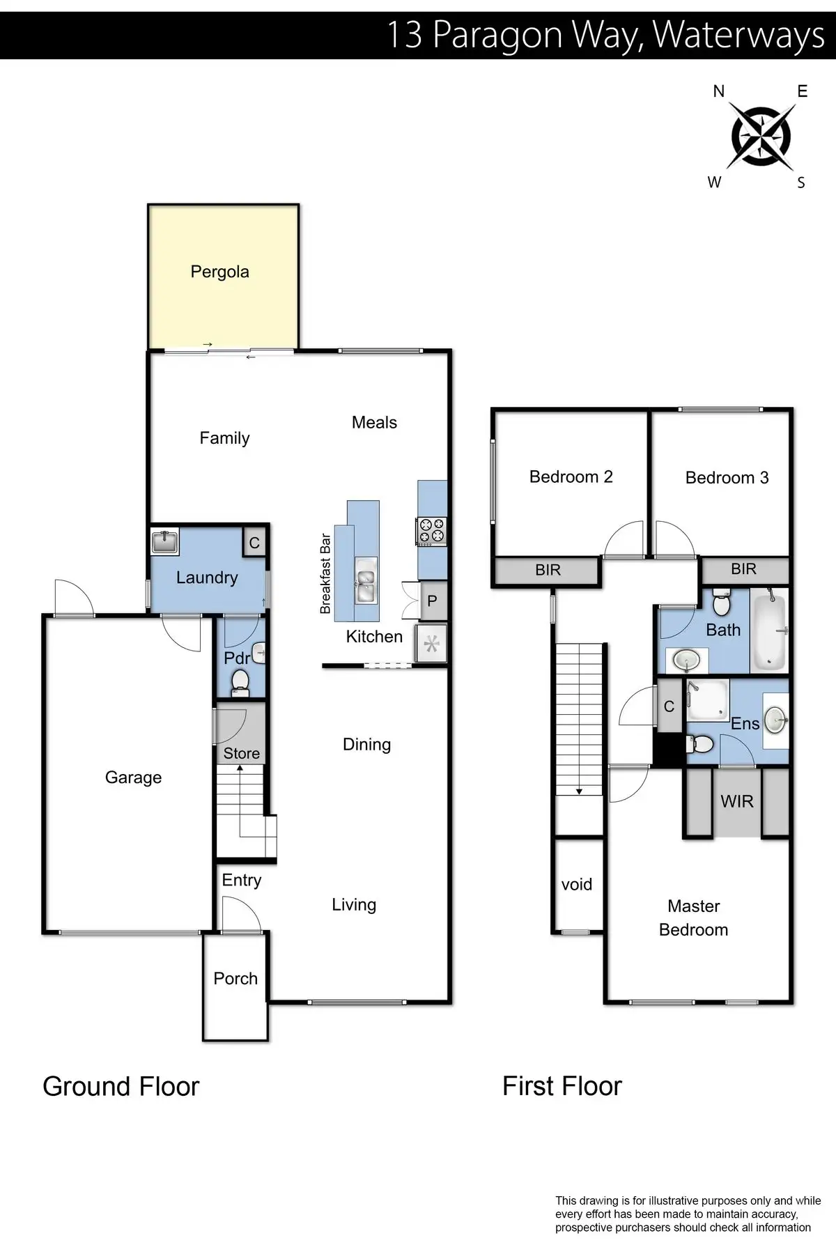 • Living and dining room, open plan kitchen, meals and family area, three robed bedrooms, two bathrooms, guest powder room and laundry