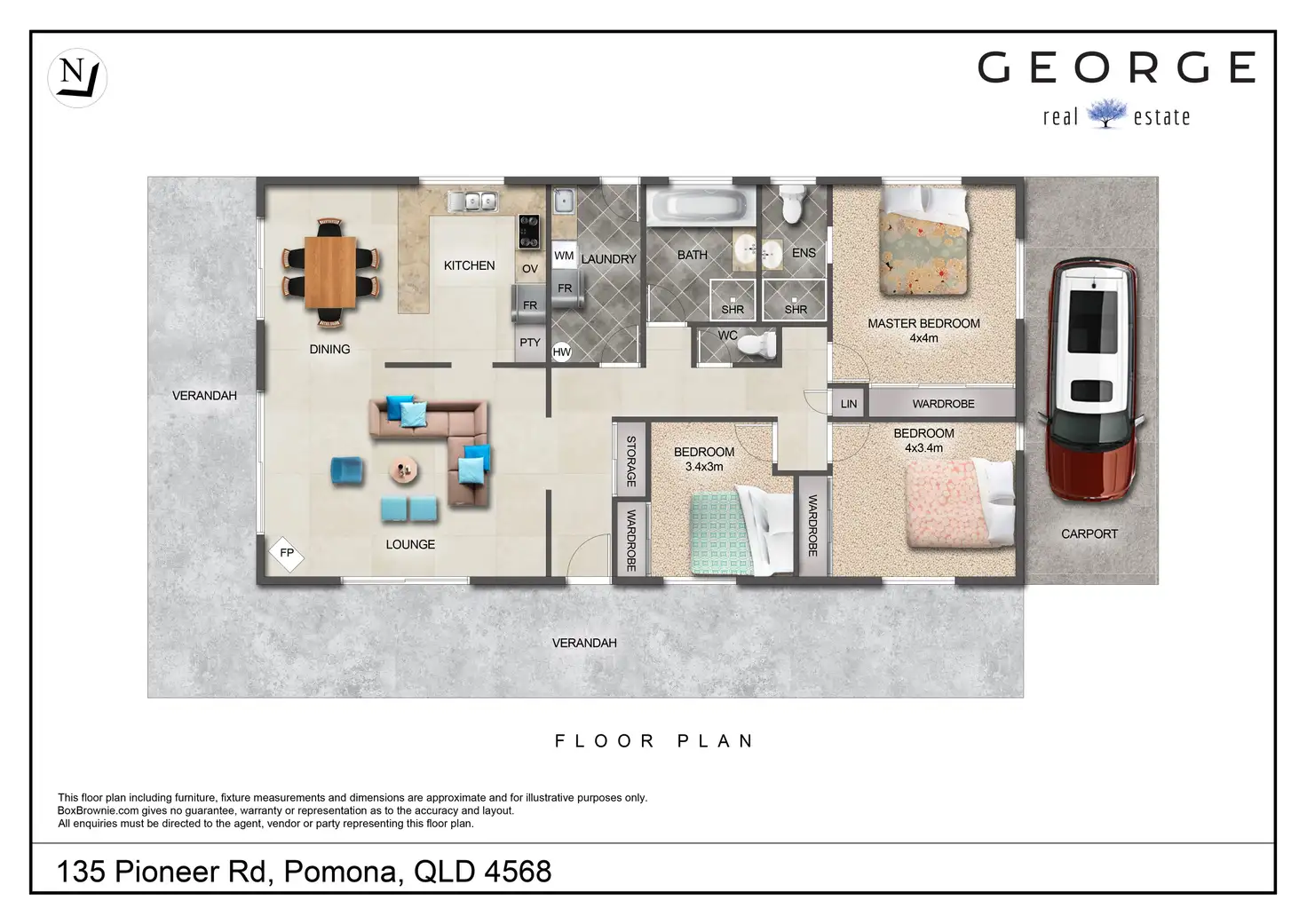 Across a single level, the home comprises three bedrooms, two bathrooms, open plan living, well equipped kitchen with adjacent dining, wrapround covered patio, separate laundry, and single carport.