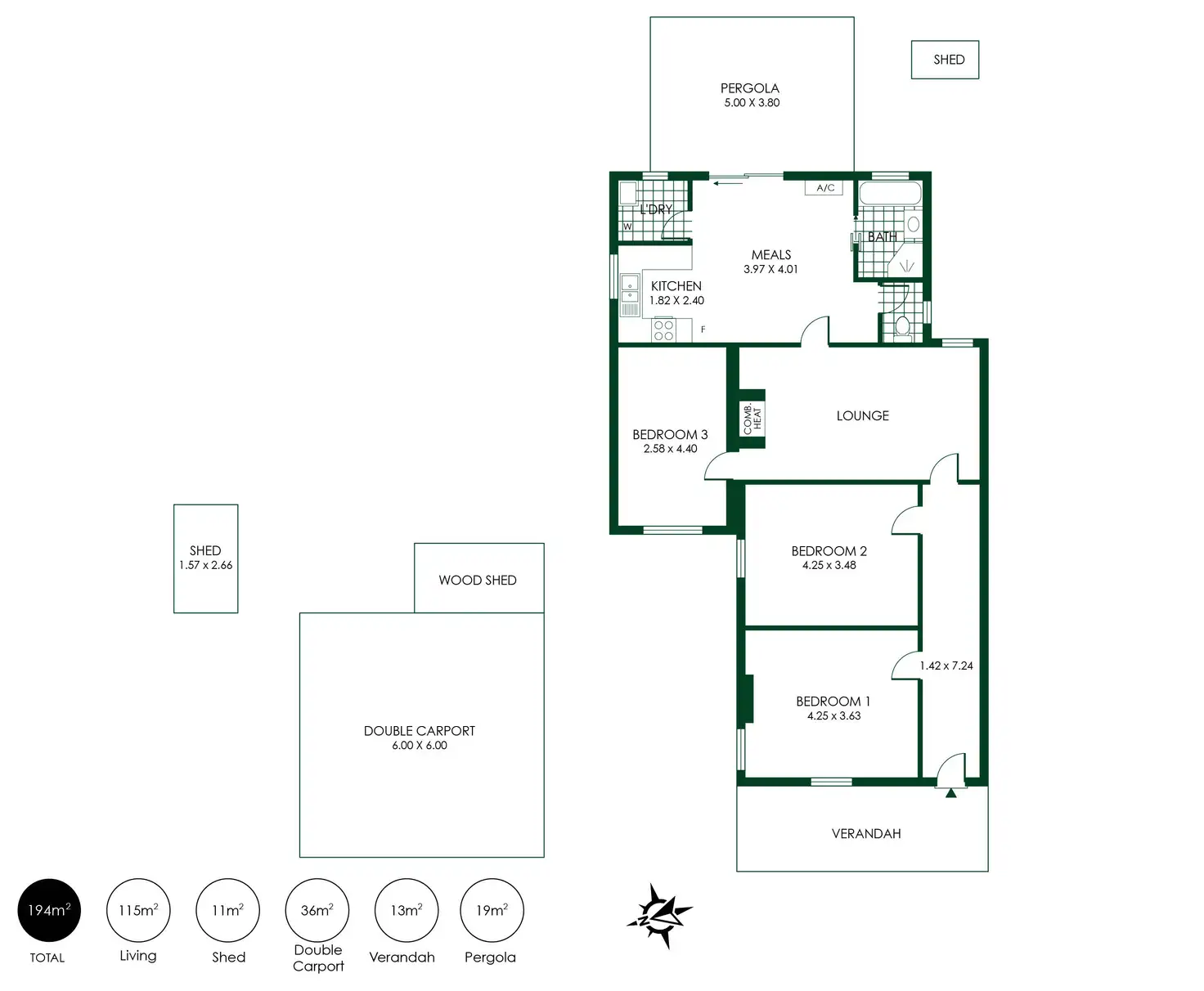Two carpeted bedrooms upon entry – including the master – precede the central living room with a combustion fire; bedroom 3 hovers alongside, while to the rear, the home signs off with a modest kitchen and meals area edged by the bathroom, laundry, and separate WC.