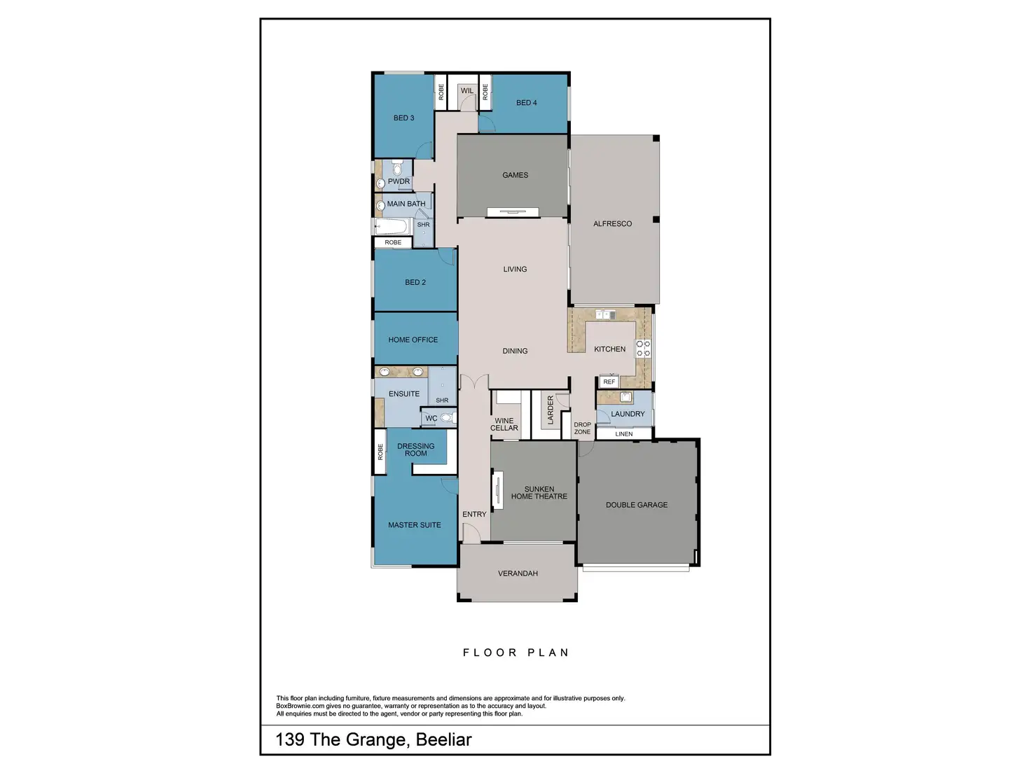 Day to day living in this home will be a pleasure, there is a sunken theatre room to curl up and watch a movie in, a home office with double glass doors to escape and work in peace, a vast open plan living area which is the heart of the home and a large games room. The luxurious master suite will rival the finest 5-star hotel with plush carpet, stylish sheer curtains, a large dressing room and spacious ensuite with double vanity, make up station and huge shower. The master is your own private oasis to escape from the stresses of everyday life. Customised features make this property unique and stand out from the crowd. If you are looking for a beautiful house with class, quality and timeless style then this is the home for you.