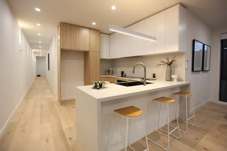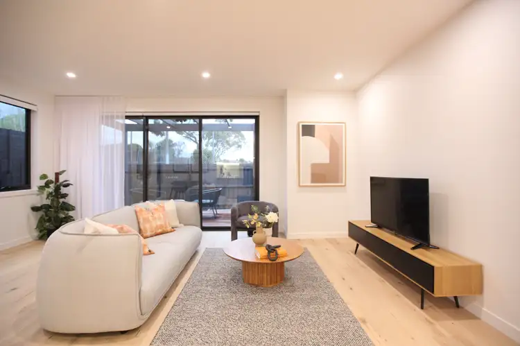 At the rear, a sunlit living and dining area forms the heart of the home, seamlessly connecting style with relaxation. The gourmet kitchen is a showstopper, showcasing premium Bosch appliances, stone benchtops, and a walk-in pantry, with a stunning waterfall island beneath a statement linear pendant light. Expansive glass doors framed by elegant linen sheers open to a private entertainer's deck, set in a low-maintenance backyard - a perfect setting for laid-back barbecues and intimate gatherings under the stars.
