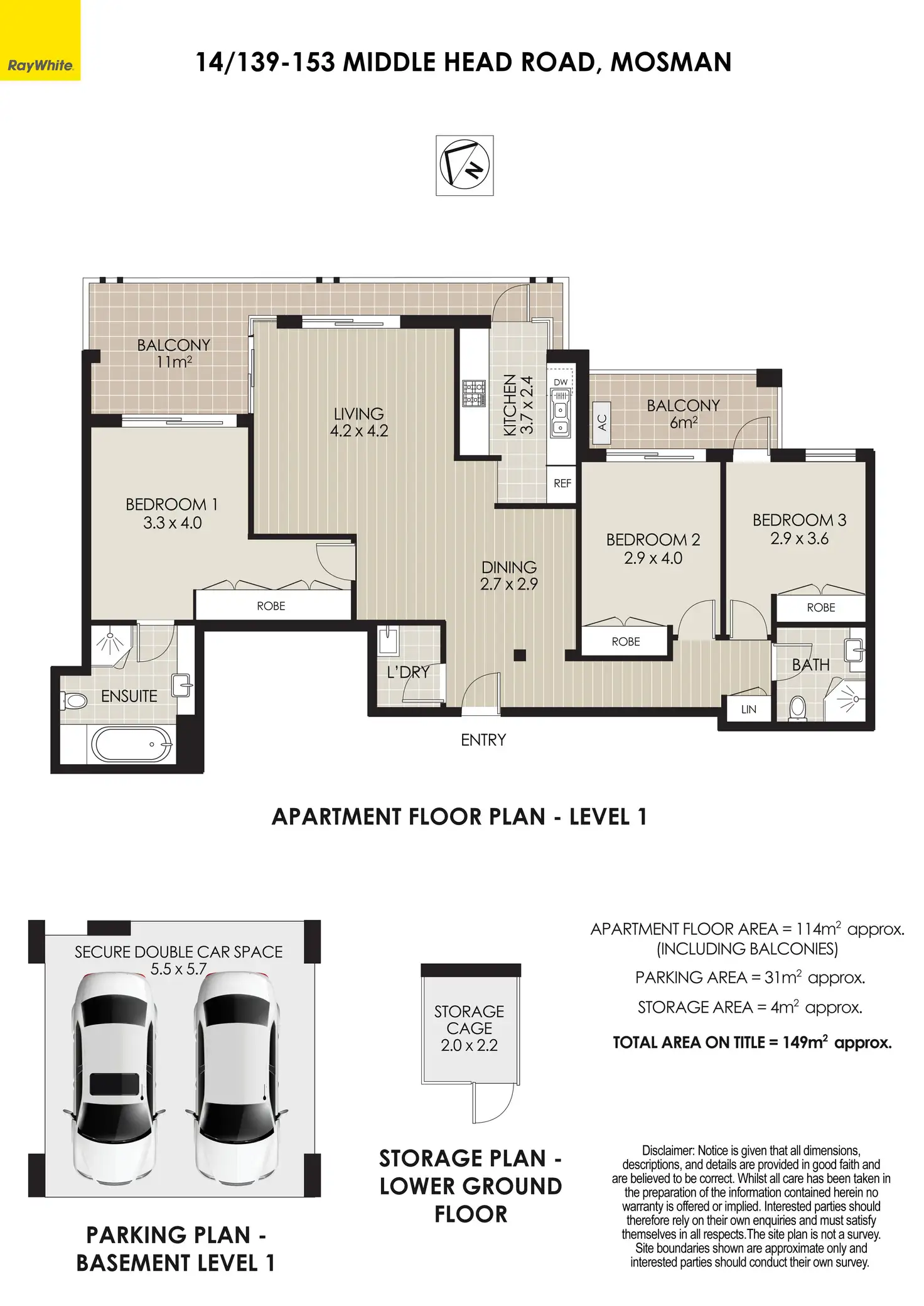 There is a gallery style kitchen with small balcony. Plush new wool carpet softens all three bedrooms, each with balcony space. The master opens into its own ensuite bathroom with separate bathtub. Walk-in laundry room with Fisher & Paykel appliances, ducted air-conditioning and level lift access from the garage and street levels. Double side by side garaging and storage cage.