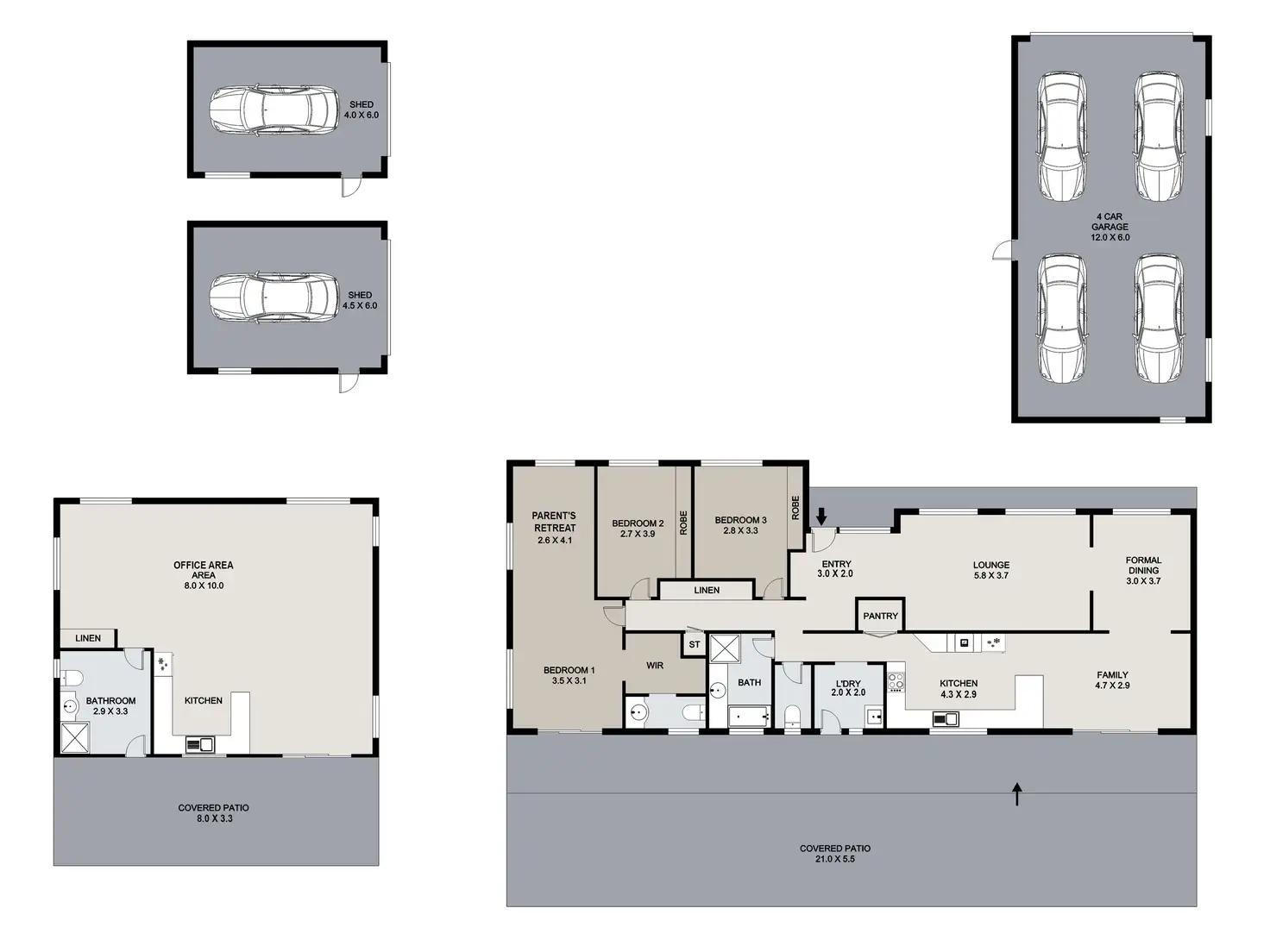 The main shed will comfortably house 4 cars and still provide a workshop area, while the other two sheds are designed for large single vehicles or your weekend toys with one of the sheds having a particularly high door and the other having a workshop area to the side. All 3 incidentally also have side pedestrian doors for additional access.