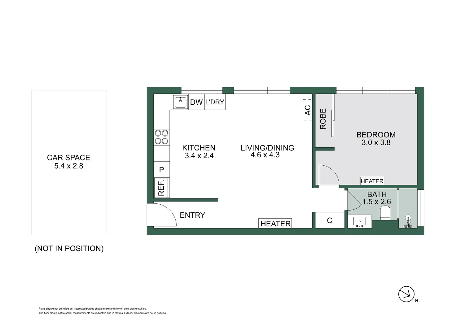 The bedroom is fitted with built-in robes, and there's a second set of cupboards in the hallway just before the separate, modern bathroom. A split-system air conditioner, panel heater, intercom entry, floorboards, a car space, and communal bike storage round things out.