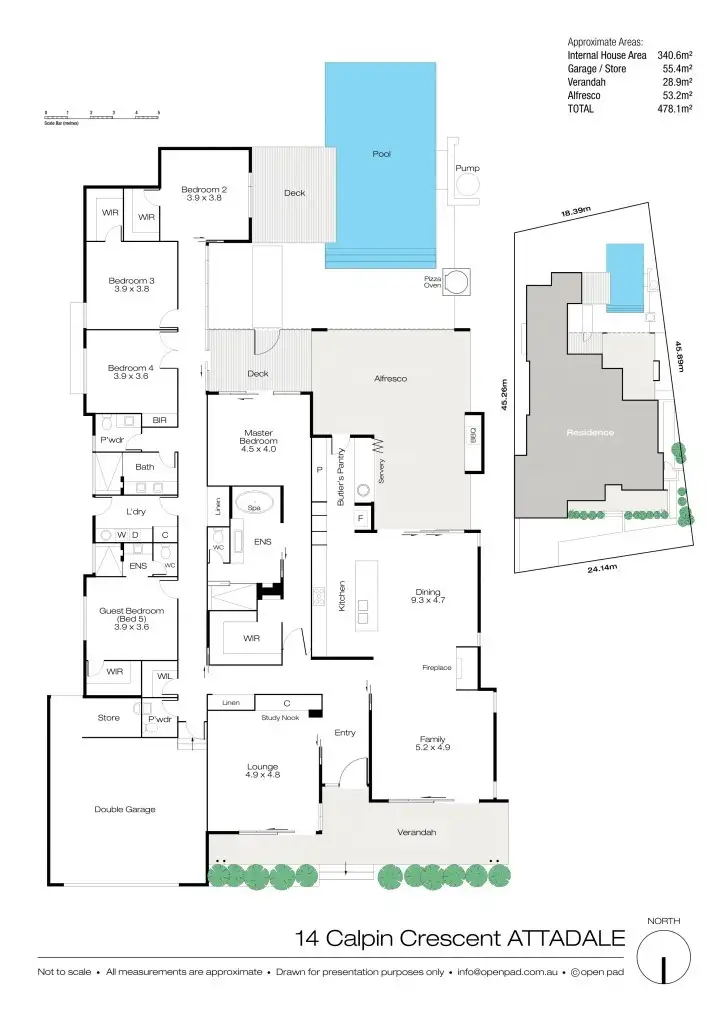 Outside, by the glass-walled, solar-heated pool, is a perfect, spacious entertaining area, complete with outdoor kitchen and pizza oven.