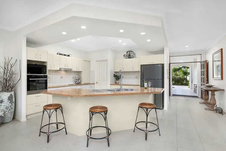 Inside, a harmonious blend of stone, timber, tile, and natural light shines through in abundance through crisp white plantation shutters. Effortlessly understated in design, the centrally located kitchen reveals seamless access to the multiple shared zones on offer and will impress the home chef with an oversized kitchen island bench, stone countertops and a generous walk-in pantry.