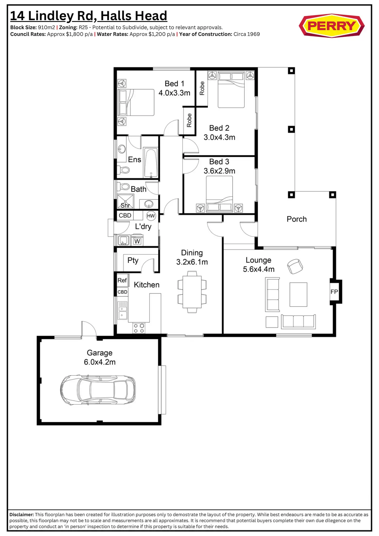 3 Bed • 2 Bath • 1 Car • 910m²