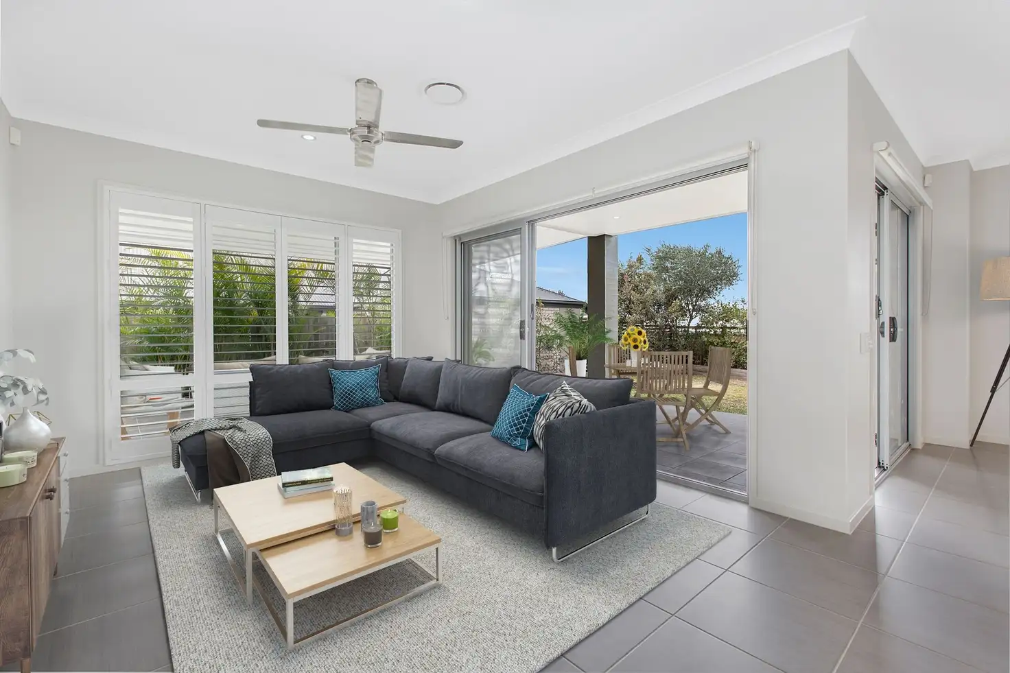 •Open plan Kitchen, Living and Dining with plantation shutters