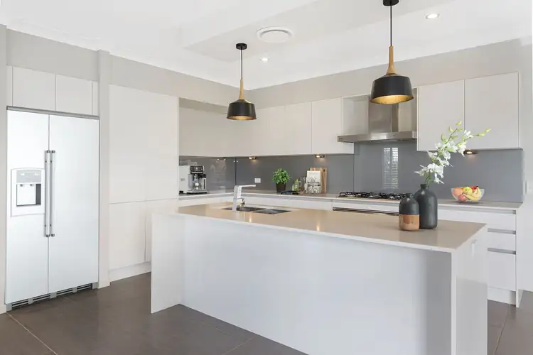 •Ultra-modern kitchen and island bench with Caesarstone top and waterfall edges, 900mm freestanding 5 burner gas cooker, double drawer dishwasher, huge 900mm pantry and feature pendant lighting.