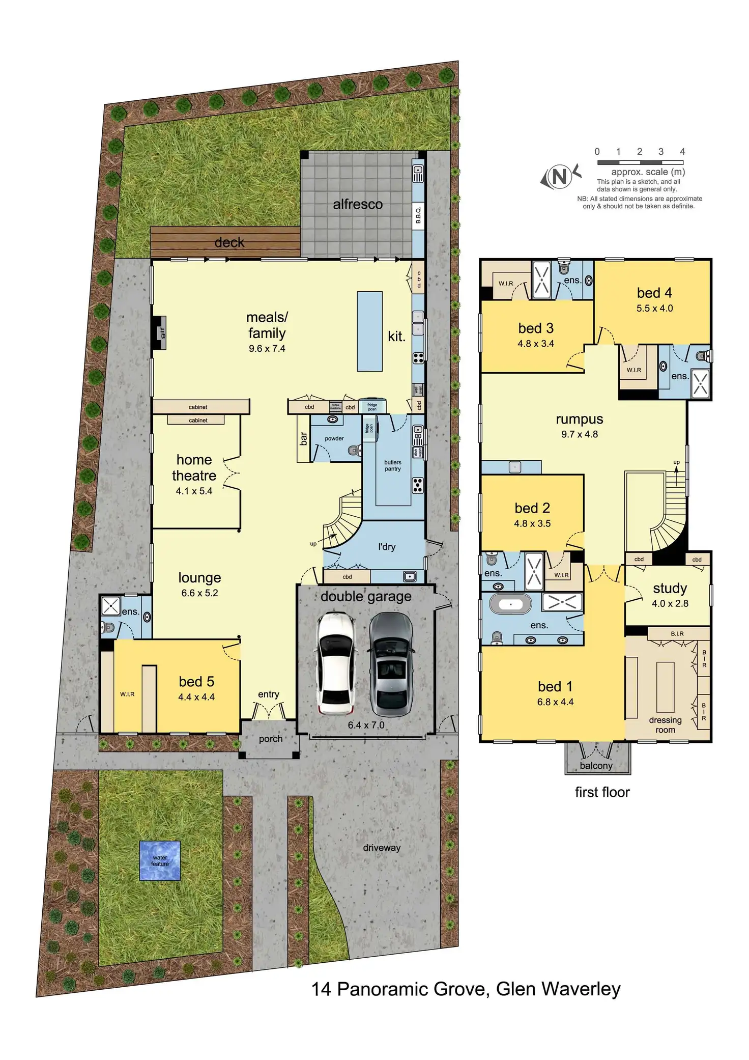 A grand, sweeping staircase delivers you up to the rumpus room with wet bar, accompanied by four of the five bedrooms, all flaunting their own fitted walk-in-robes and luxe ensuites, including the master bedroom with Juliette balcony, large private study, dressing room and indulgent ensuite.