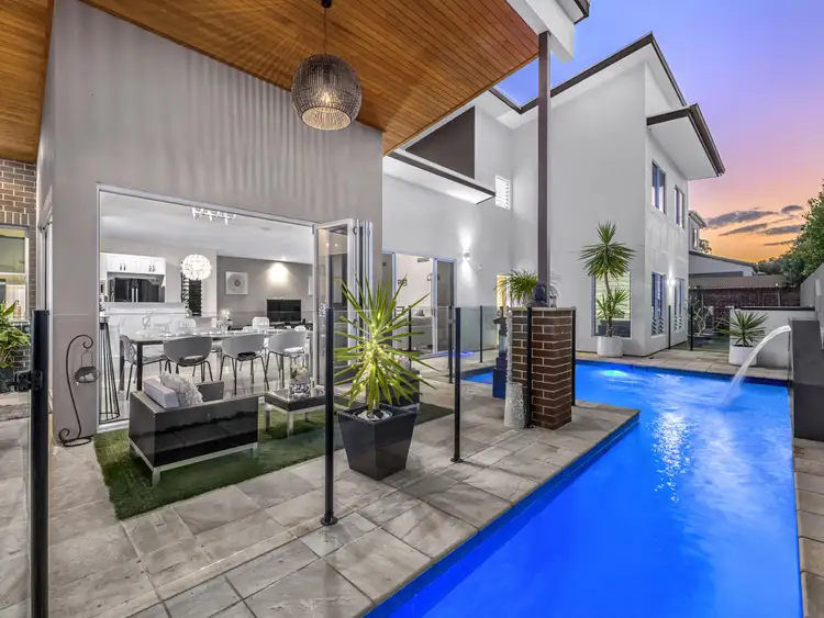 Presenting with 5 bedrooms, 4 bathrooms and multiple indoor and outdoor living areas, the architecturally designed and custom built home exudes style and panache at every turn. The street presence is commanding, set at the end of a cul de sac and surrounded by like quality homes, the property is framed by secure fencing and back to house camera and intercom security.