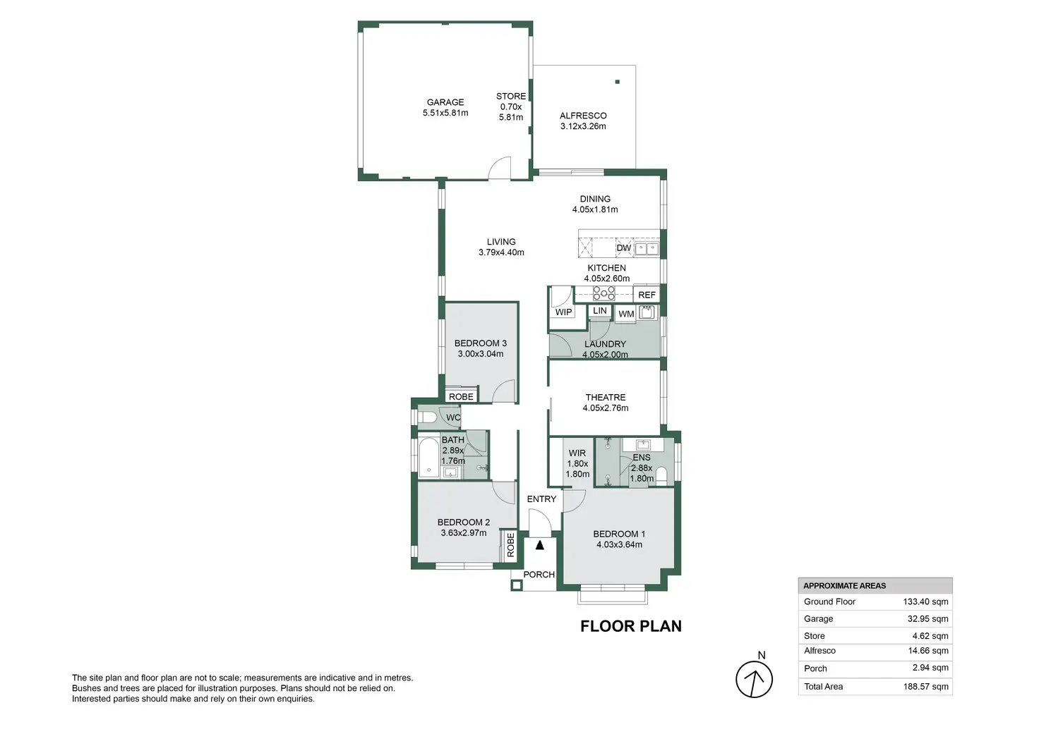 The heart of the home flows seamlessly from the open-plan living and dining area into a modern kitchen, featuring 900mm appliances, neutral colour schemes, stone benchtops and a large walk in pantry. Along the main hallway is a dedicated theatre room, perfect for movie nights or family entertainment. From the dining area, the home opens onto a covered alfresco, ideal for entertaining or enjoying quiet moments outdoors, making it a home designed for both comfort and lifestyle. Downlights fitted throughout the home create a bright and modern atmosphere, while the ducted reverse cycle air conditioning keeps every room comfortable all year round.