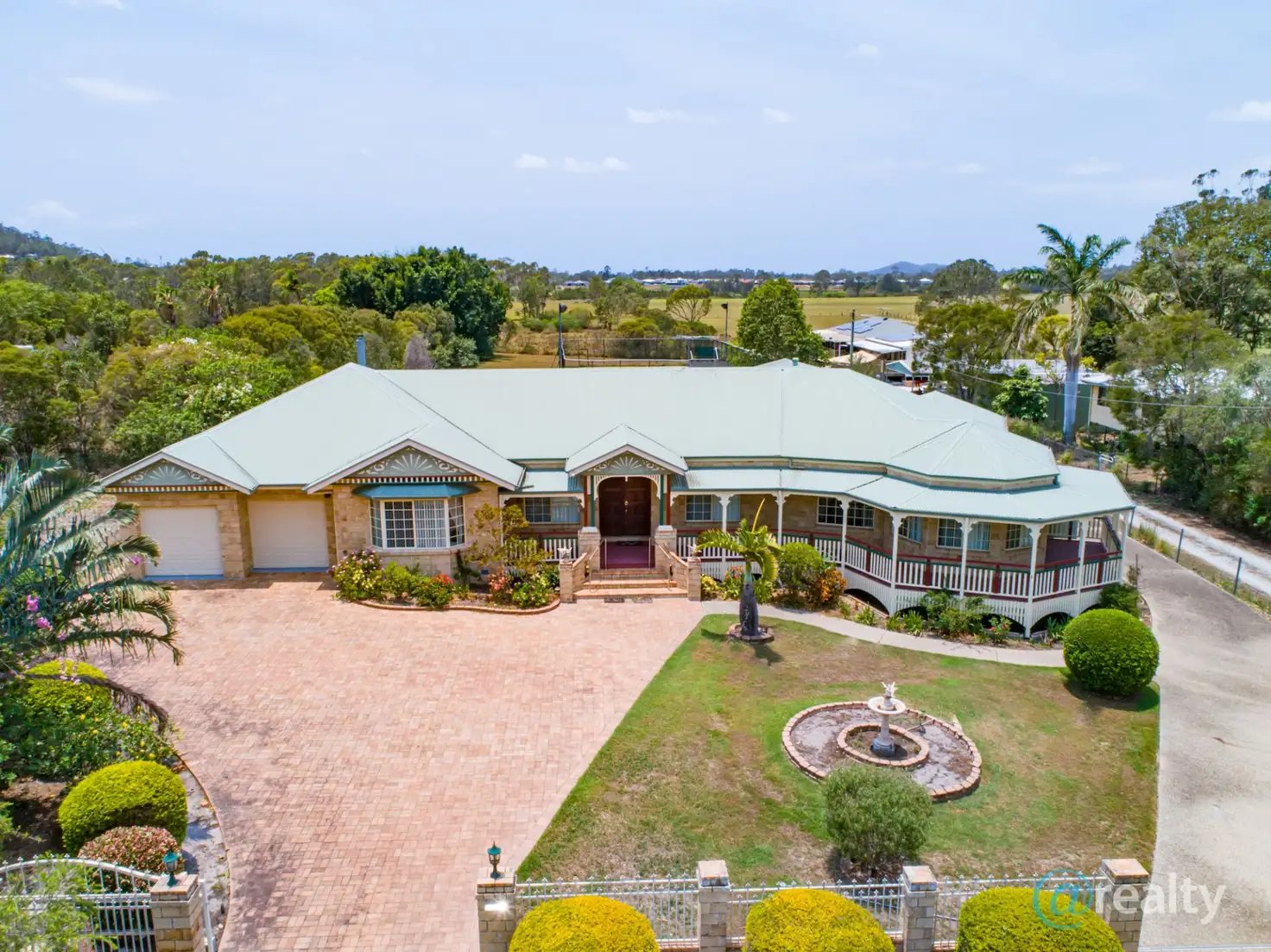 This traditional colonial style, cream sandstone solid home on one level sits wide on the block and in full view, with several steps leading to the ornate front doors. The double remote garage is to the left and the wraparound balcony frames to the right of the house.