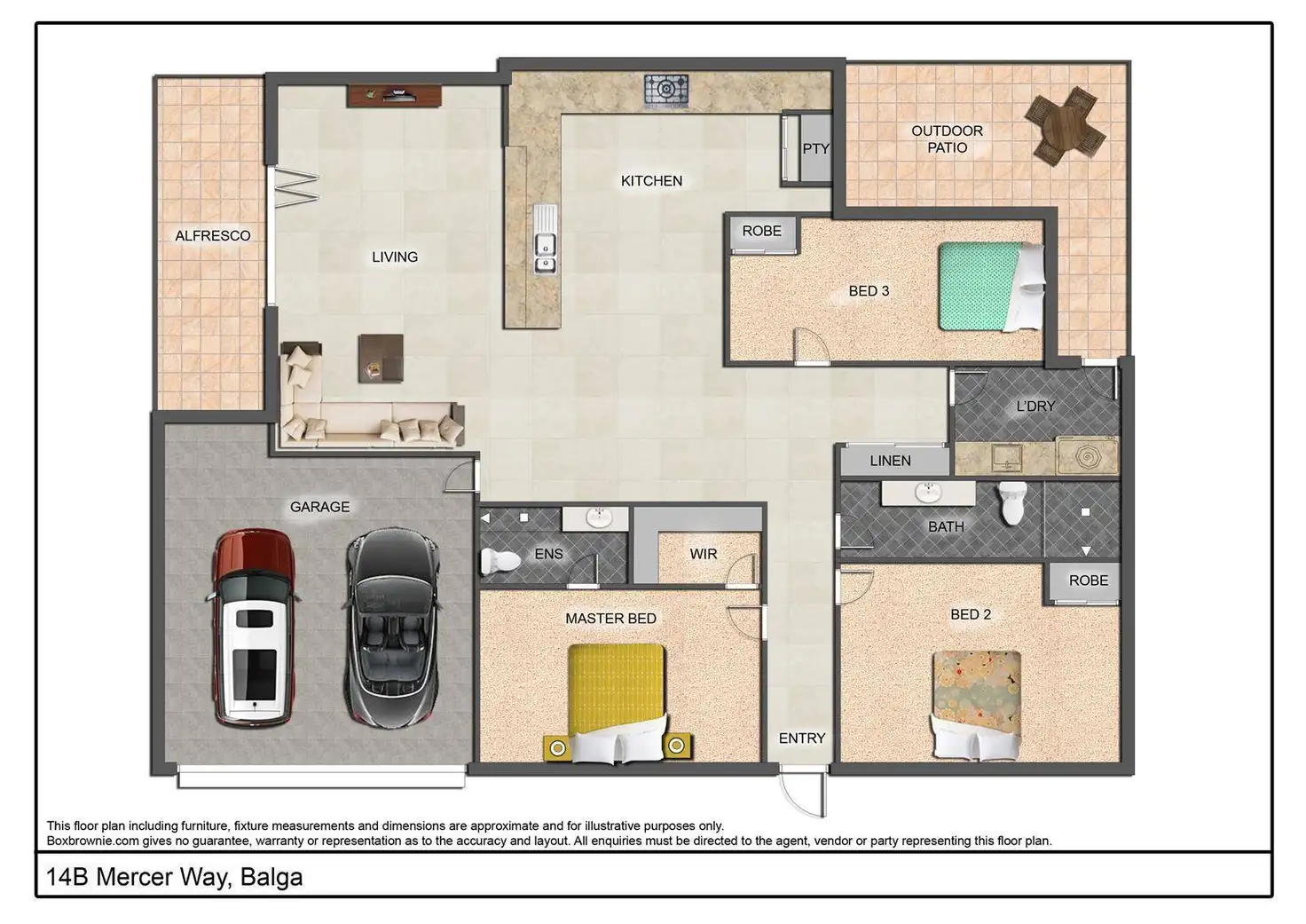 As you enter this home you are greeted with a large entry foyer that flows into the home and through to the living areas. The Master bedroom suite is located at the front of the home and comes complete with ducted air conditioning, walk in robe, roller shutters and adjoining ensuite.