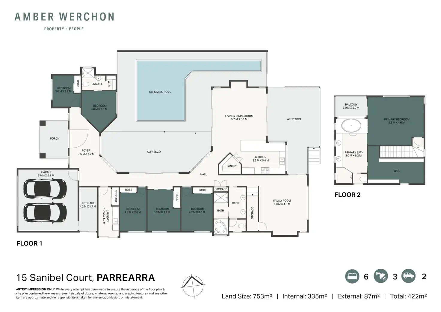 Across approximately 422 square metres, the residence comprises grand entry foyer (which truly sets the tone for what lies within), six bedrooms, three bathrooms, separate living areas, premium kitchen with walk-in pantry, two separate alfresco living zones, separate laundry, and double lock-up garage with storage.