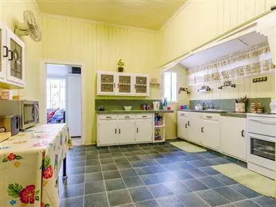 Tenure: Freehold Property condition: Good Property Type: House House style: Highset, Queenslander Garaging / carparking: Single lock-up Flooring: Carpet, Tiles and Timber Window coverings: Drapes, Curtains Electrical: TV aerial Property Features: Safety switch, Smoke alarms Kitchen: Original, Standard, Separate and Double sink Living area: Separate living, Separate dining Main bedroom: King and Ceiling fans Bedroom 2: Double Bedroom 3: Double Bedroom 4: Double Additional rooms: Family, Office / study, Sleepout Main bathroom: Bath, Separate shower Family Room: Ceiling fans Laundry: Separate Views: Private Outdoor living: Entertainment area (Covered, Concrete), BBQ area Fencing: Fully fenced Land contour: Flat Grounds: Tidy, Backyard access Sewerage: Mains Locality: Close to shops, Close to transport, Close to schoolsLand details
