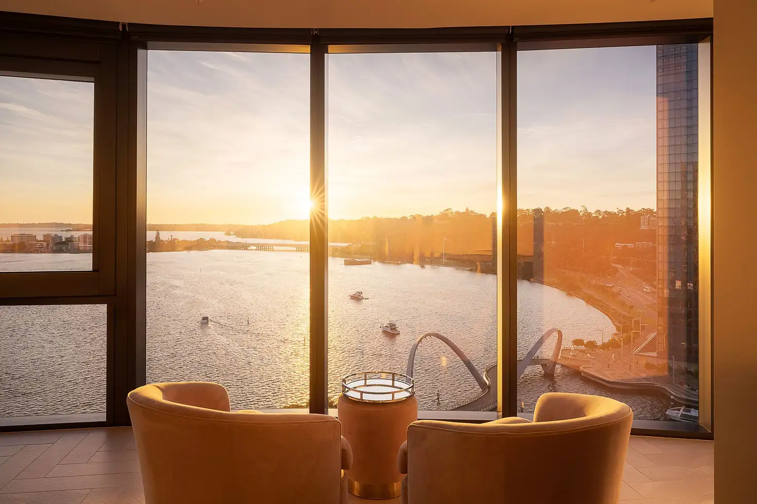 This world-class, three-bedroom, three-bathroom luxury apartment occupies a coveted position on the fifteenth floor, offering uninterrupted vistas across Elizabeth Quay, Kings Park, and the shimmering expanse of the Swan River. Floor-to-ceiling windows frame a living canvas of ever-changing light and colour, transforming each moment into something extraordinary.