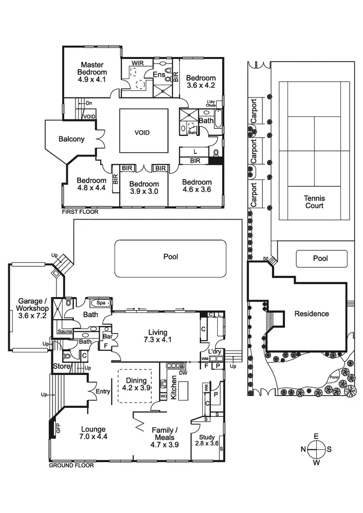 Still on ground level, enjoy a stately study with integrated shelving, and a family sunroom basking in the northern sun. Spill outside to an inviting swimming pool and terrace, complemented by a north/south, floodlit tennis court. This refined yet relaxed entertaining area will be enjoyed all year round.