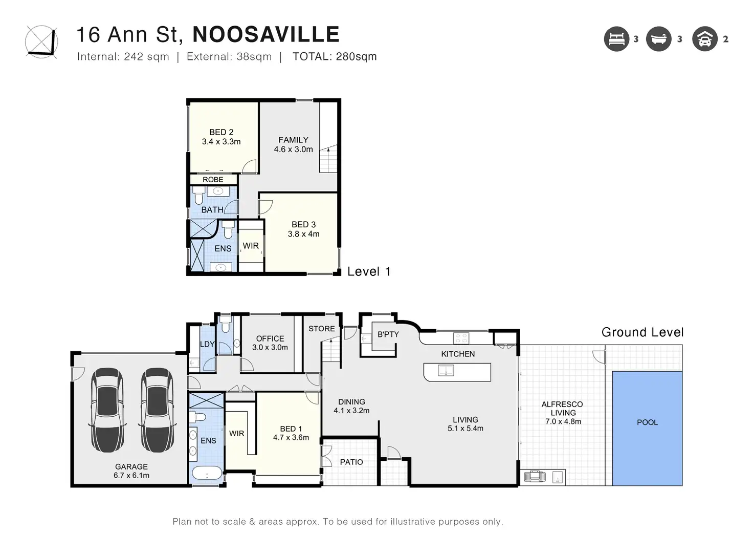 • Three bedrooms, two of them are ensuited with walk in robes, providing flexible and private accommodation options.