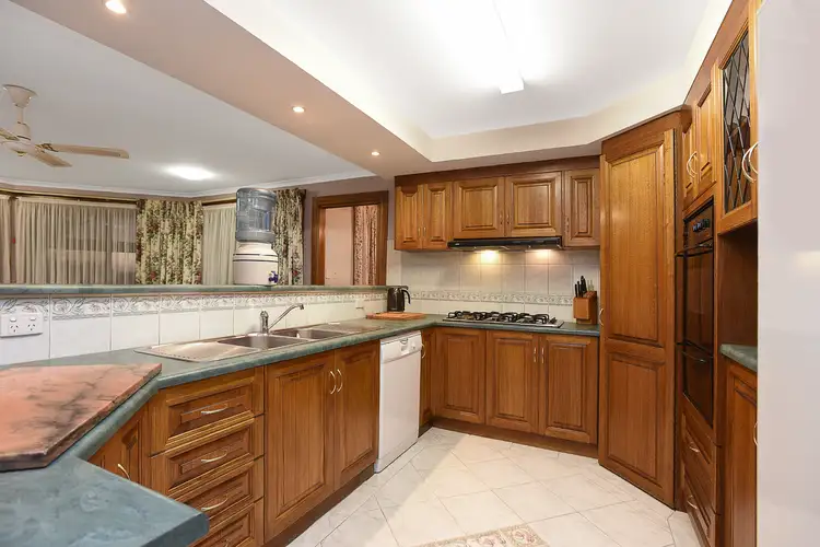 The downstairs area includes two more living areas: a large oblong formal lounge/dining room with double-door entrance, ceiling fan and electric heater, while the vast tiled open-plan living/dining area is ideal for everyday living. The spacious timber kitchen includes large gas cooktop, vaulted ceiling, double sink and plenty of storage, including a large pantry with under-stairs storage.