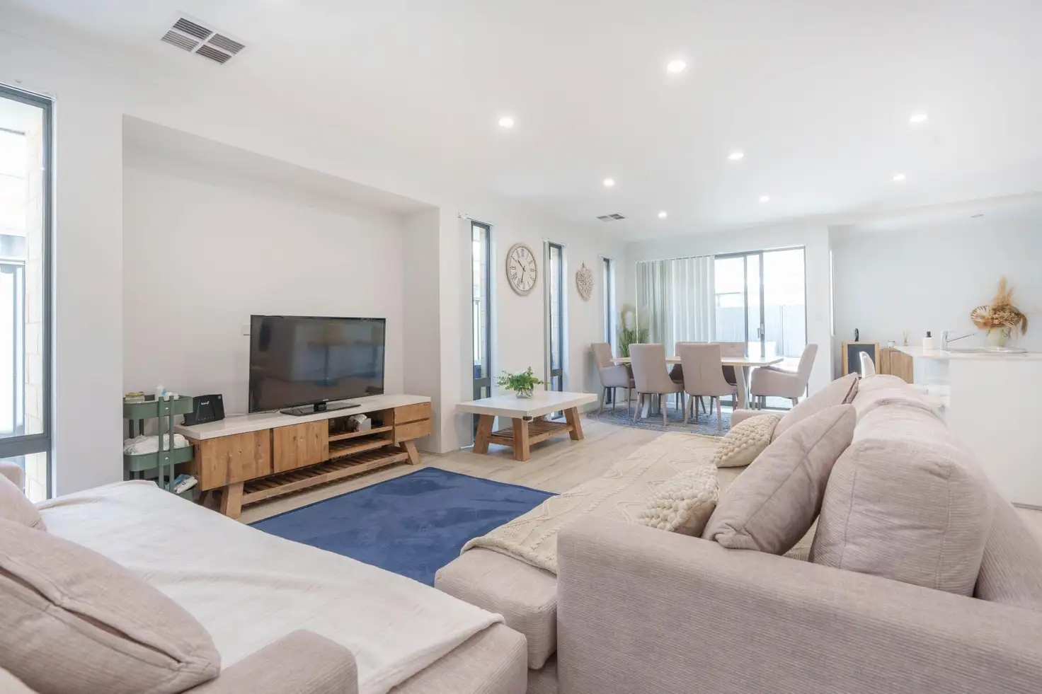 - Open kitchen, living, and dining with stylish bulkhead in the living area