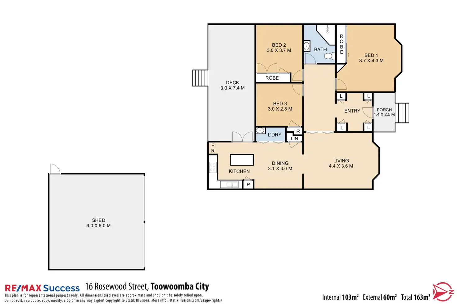 - Detached 6m x 6m powered shed, rainwater tank, and low-maintenance backyard