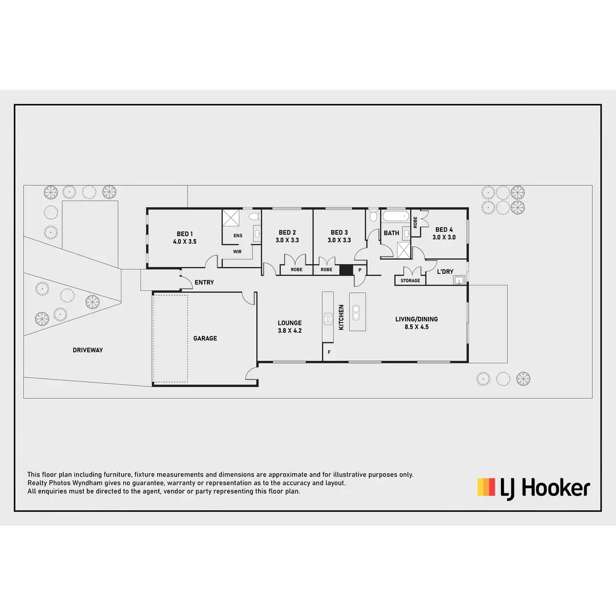 - Accommodation includes four spacious bedrooms, offering both comfort and privacy. The master suite features a walk-in robe and ensuite, while the remaining three bedrooms are equipped with built-in robes and convenient access to the modern bathroom.