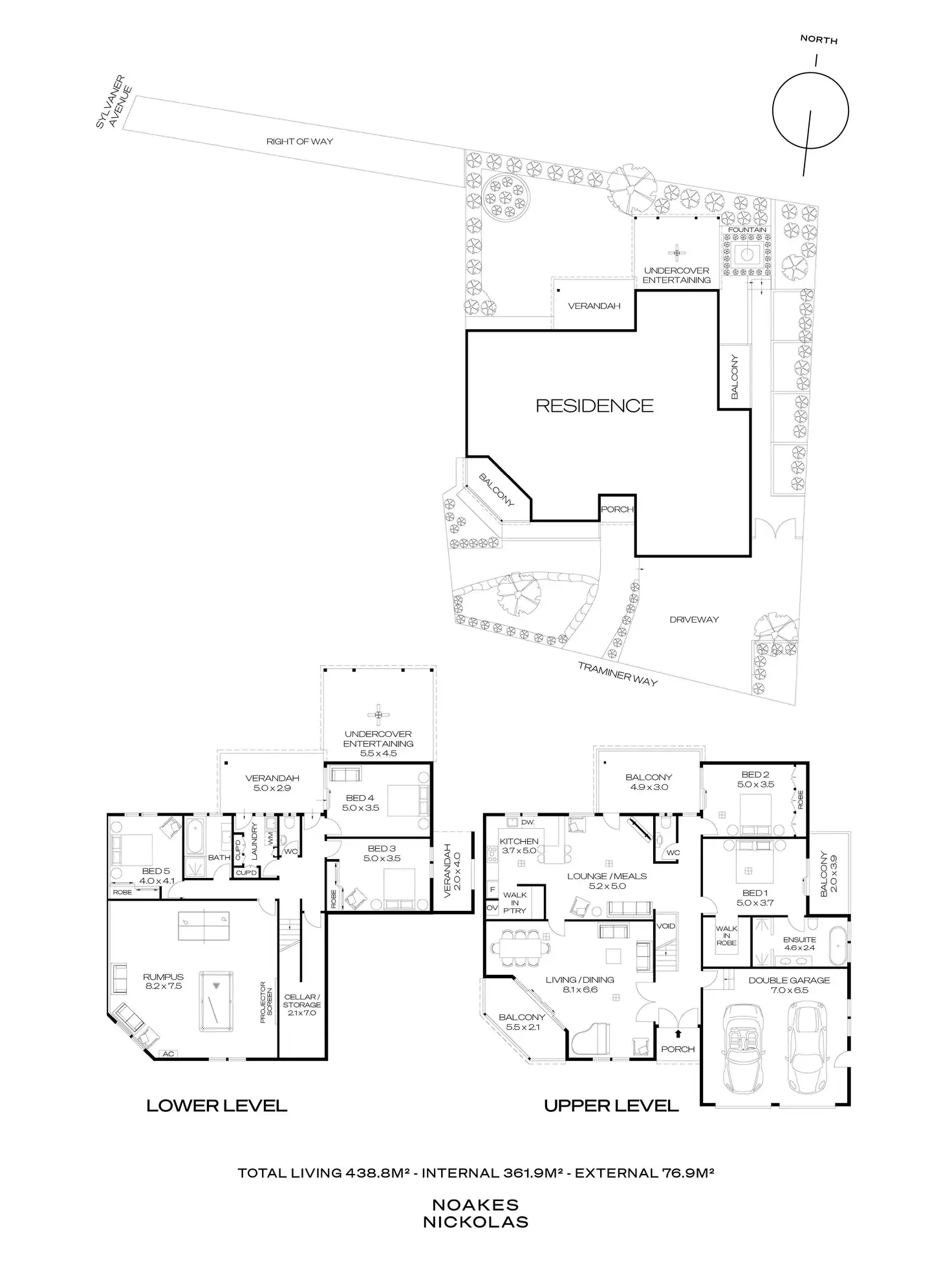 • 438.8m² of total living including multiple living, dining and entertaining spaces across upper and lower floors