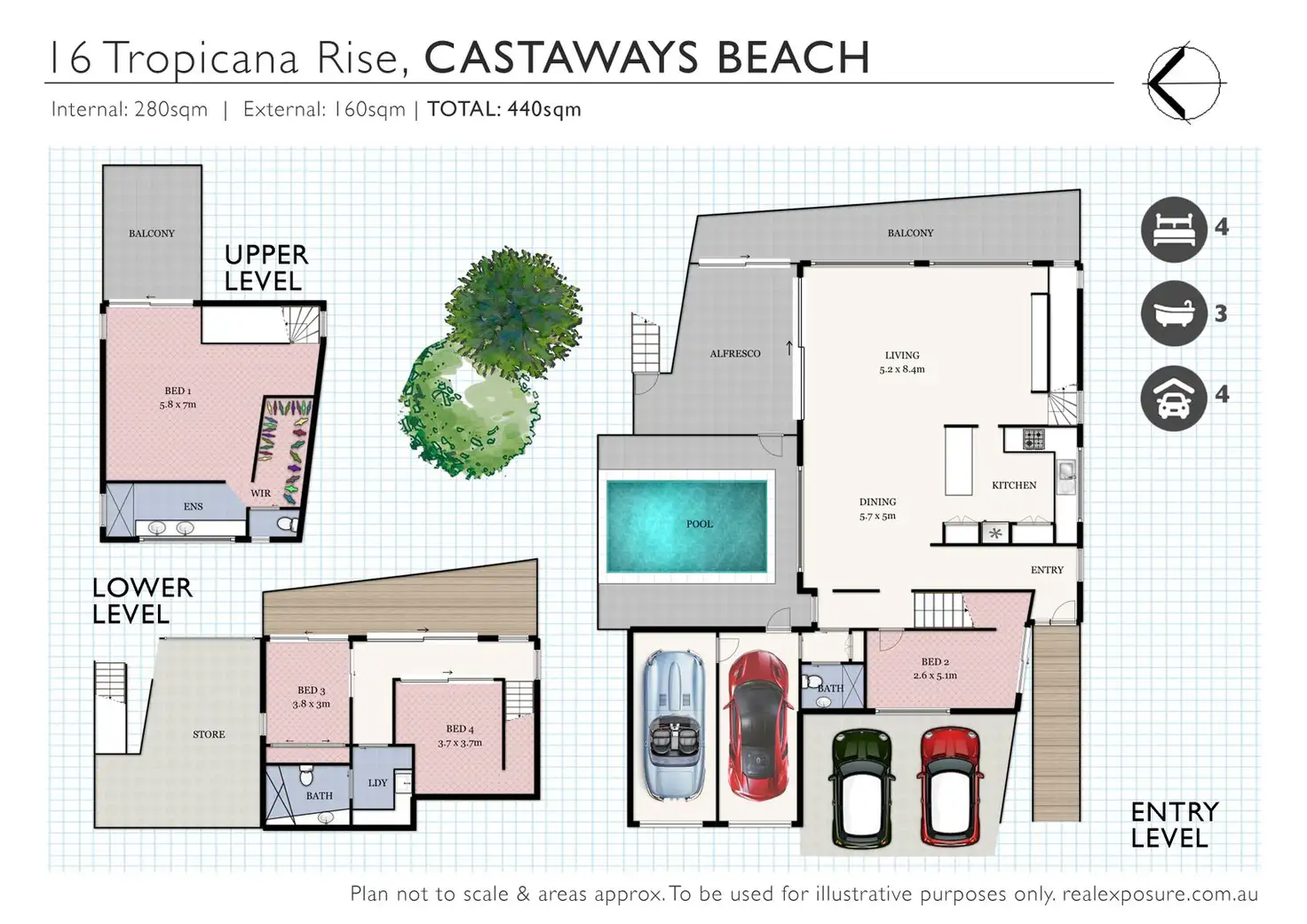 Overlooking beautiful Castaways Beach, this home is spread across three levels. Upstairs the master is complete with air conditioning, en suite, large walk in wardrobe and separate toilet. This level also has a spacious balcony, ideal for private sunbathing, reading or just nodding off to the sound of the surf.