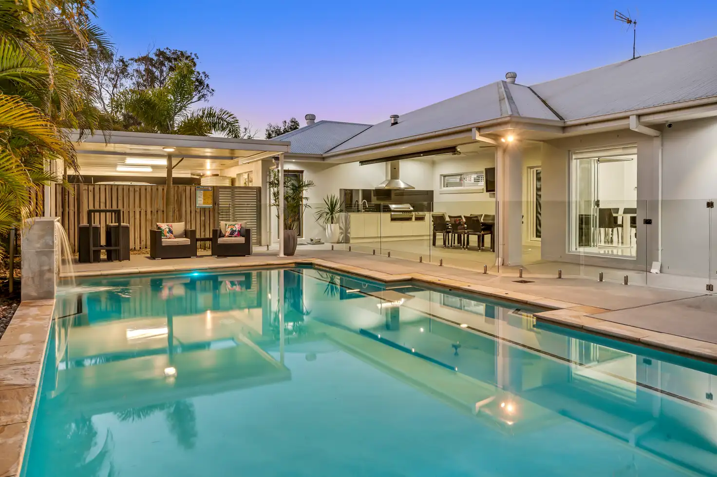The centralised, modern kitchen is fully equipped with stone benchtops, pendant lighting, 5 burner gas stovetop, double fridge cavity, high-end appliances, and a walk-in pantry. This impressive kitchen is ideal for serving and entertaining family and guests. The breath-taking outdoor entertaining area optimises the space with a stunning in-ground swimming pool is complimented by landscaped gardens, glass fencing a feature waterfall. Pool-side relaxation is made easy with the covered alfresco that creates the perfect space for sunbeds or a dry-bar. The entertaining area is the ultimate outdoor dining experience with a built-in kitchen that features stainless steel appliances, built-in sink and BBQ with plenty of space for food preparation.