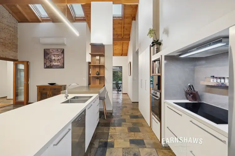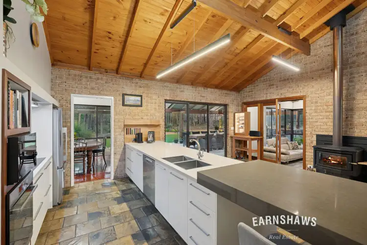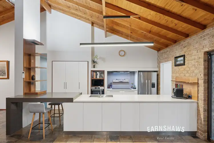 The house itself is designed for proper, spacious, warm family life. Four bedrooms each with built-ins so everyone gets actual room and real storage. Two modern bathrooms so mornings run smoother. Multiple living zones means everyone can peel off into their own favourite spots when they need a break or pile back in together when it's time to eat, catch up, or stream. The kitchen is a very attractive worker with European appliances, slate floors, and those soaring exposed timber ceilings that make this open-plan space so special. Jarrah floors in the formal lounge and dining give you a bit of natural charm and the open-plan informal space works as hard as you do: slow combustion wood heater, ceiling fans, and a flexibility to evolve as your crew grows and changes.