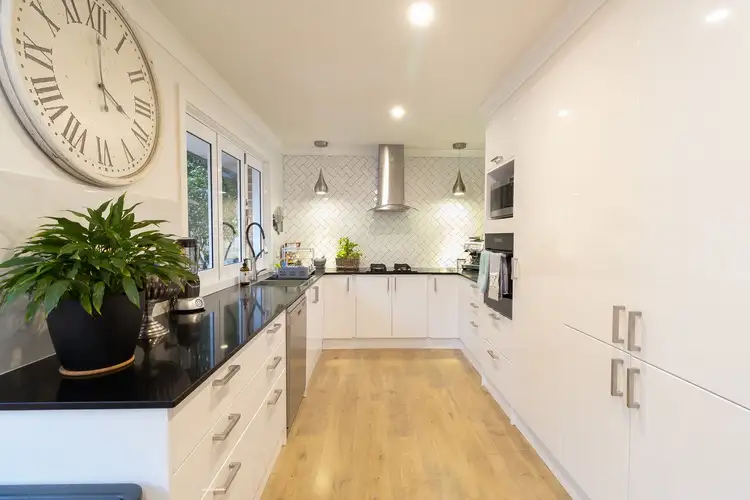Renovated kitchen boasting exquisite style and quality, stone benchtops seamlessly integrated with a gas cooktop, abundant storage, electric oven, dishwasher, pass to entertaining area