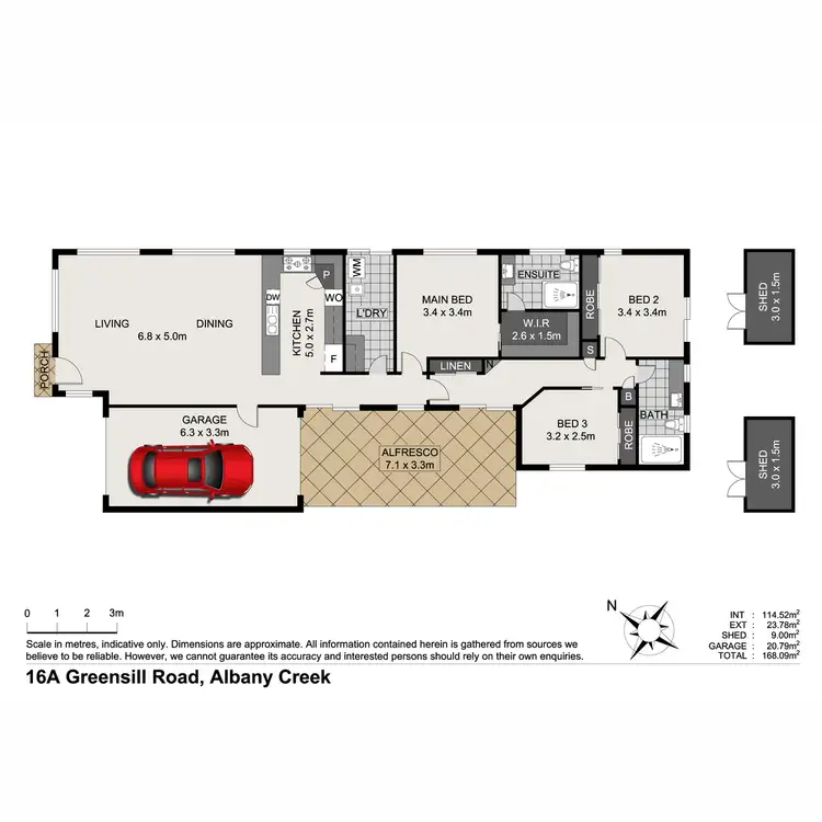 Outside there is a covered alfresco entertaining area, with surround sound speakers and plenty of space in the easy-care yard for a veggie patch or trampoline. There are also two garden sheds for additional storage.