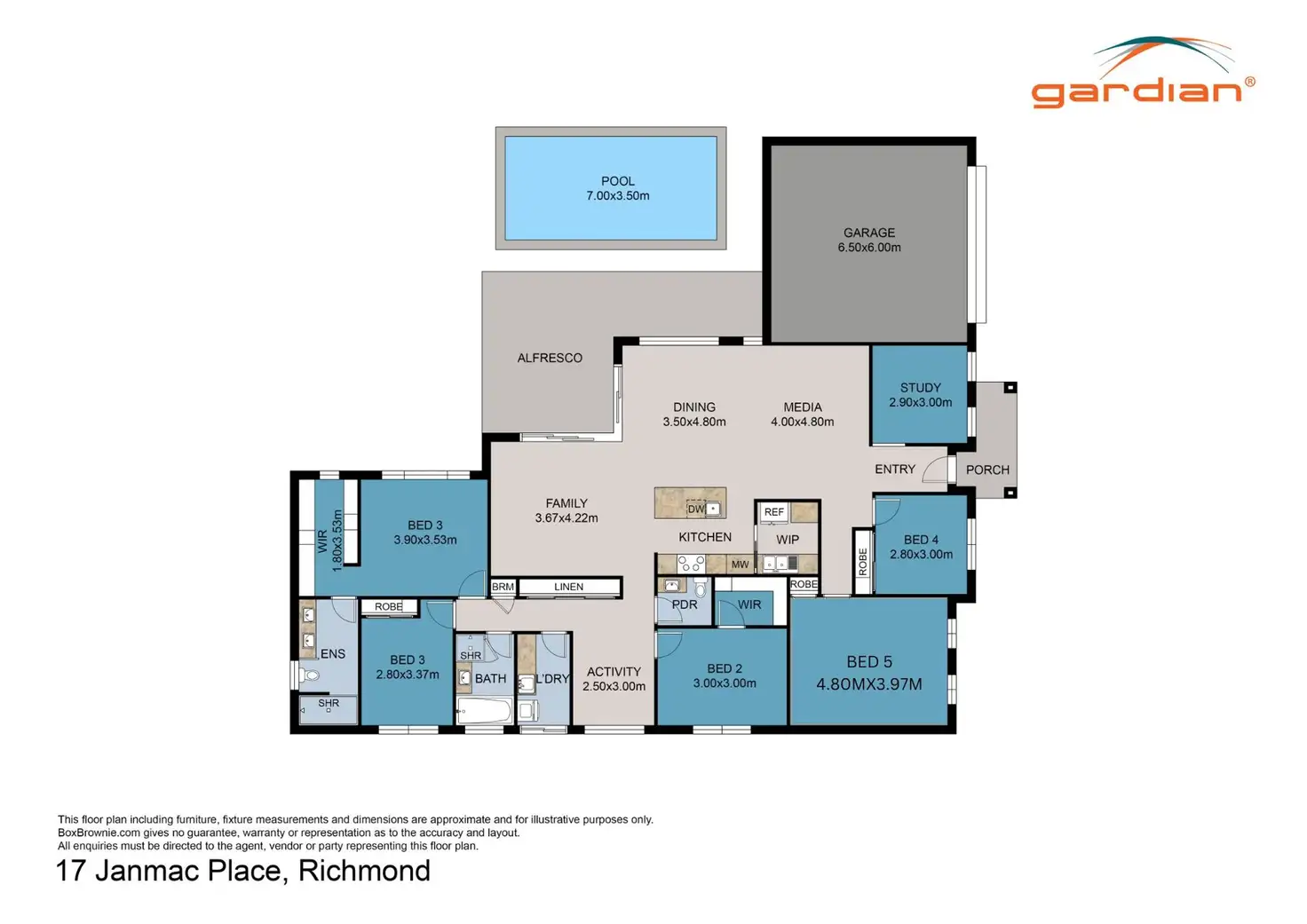 The residence offers five generously sized bedrooms, including a standout master suite that impresses with a walk-in robe and an exceptional ensuite featuring a walk-in shower and his-and-her vanities.