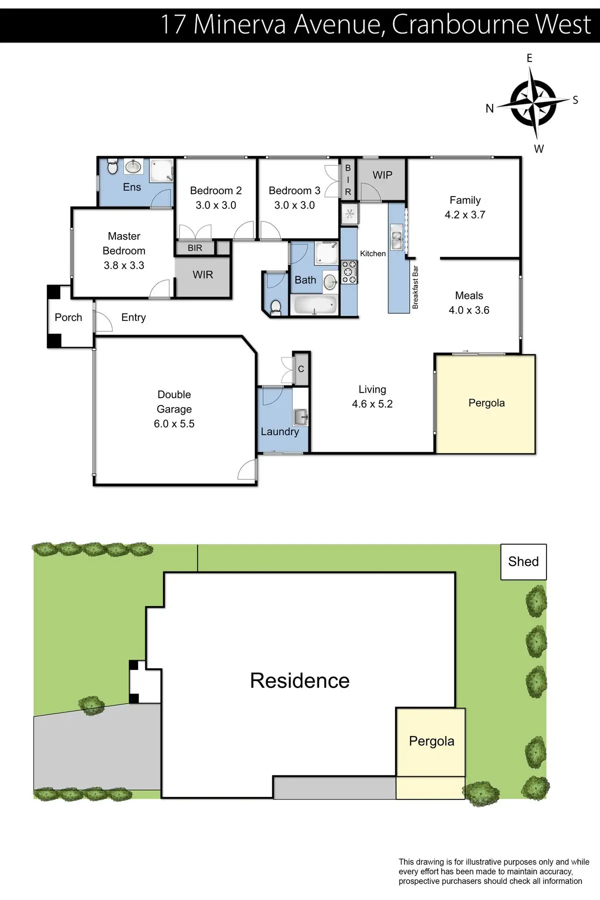 Pergola with timber decking, low maintenance gardens, grassed yard, storage shed and double garage