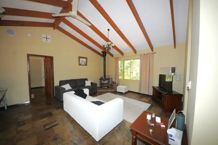 Consisting of four large bedrooms all with BIR's. The main has a huge ensuite with roman shaped spa, slate floors, floor to ceiling tiles, plus, plus, the list goes on ... The main bathroom is light, bright and appealing in every way. With two very spacious living areas, high gable ceilings with exposed beams and beautiful slate floors throughout, these are just some of the features that add to the ambience of this lovely home. A large slow combustion wood fire, supplies free heating in winter, keeping you toast warm and ample air conditioning units supplying cooling on the hot summer days.