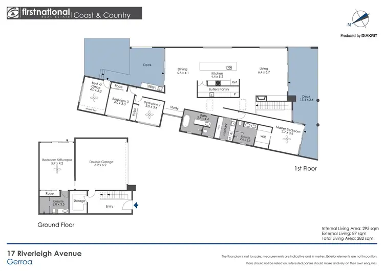 The spacious master suite includes a walk-in robe and ensuite, complete with stylish fittings, floor-to-ceiling tiling and bespoke joinery. The bedroom also opens onto the front deck, with views of Crooked River and Seven Mile Beach. This level also includes two more bedrooms plus an office or fourth bedroom, main bathroom, laundry, study nook, and a covered rear entertaining area perfect for firing up the BBQ or pizza oven, which opens onto low maintenance north-facing backyard.